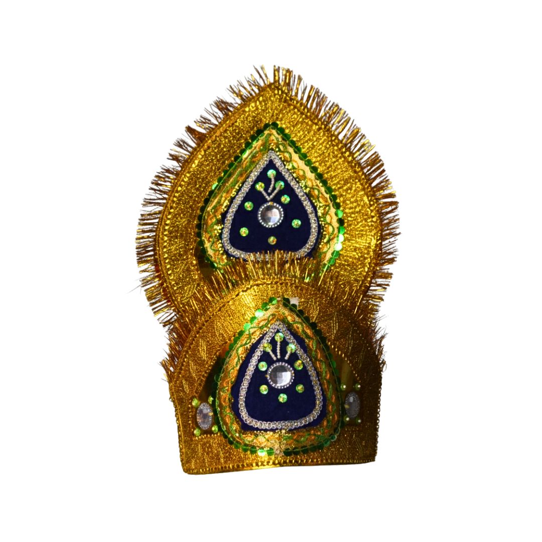 A symbol of divine brilliance, the Golden Majesty Mukut is crafted with intricate gold lace, deep navy-blue velvet detailing, and green stone embellishments. The shimmering golden border and elegant teardrop motifs create a regal aura — perfect for adorning Lord Krishna, Bal Gopal, or Radha Rani idols.