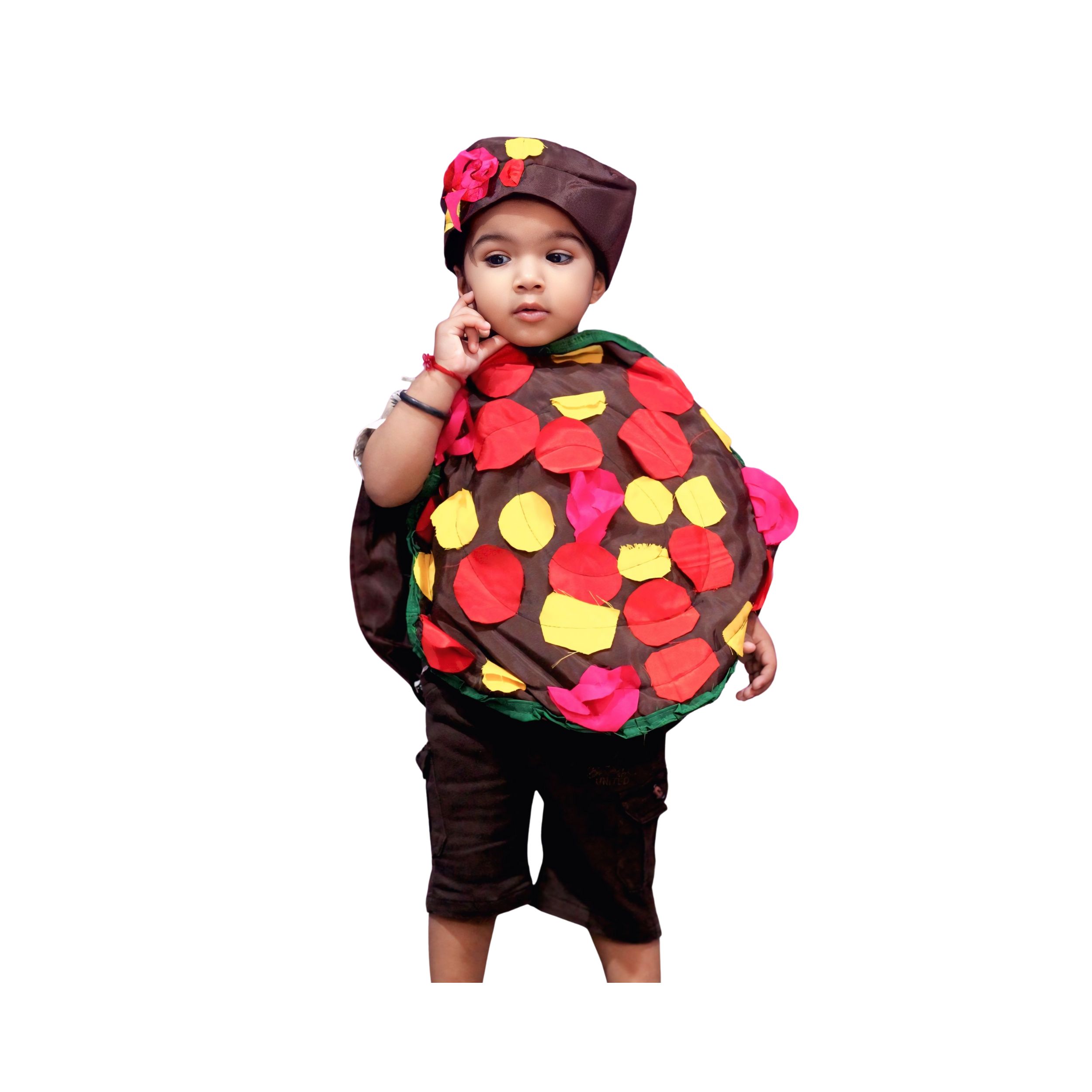 A fun and colorful Pizza Costume designed for kids, featuring a brown base with bright red, yellow, and green toppings. Made from soft, comfortable fabric, it gives a realistic and playful pizza look — perfect for school events, food-themed parties, and fancy dress competitions.
