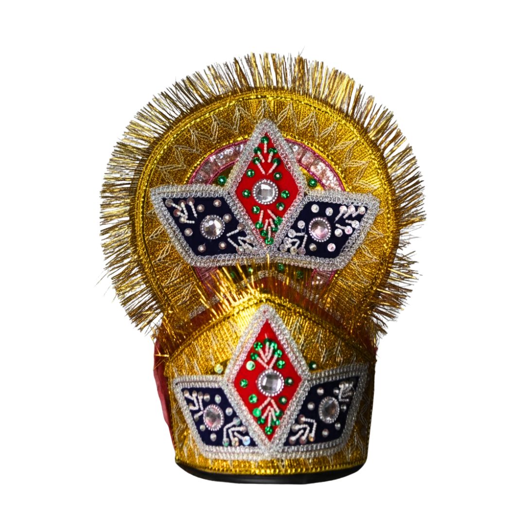 Radiate divine brilliance with this Golden Regal Temple Mukut, crafted to perfection for deities and festive occasions. The mukut glows with rich golden fabric, detailed with vibrant red, green, and blue diamond-shaped embellishments — symbolizing power, devotion, and prosperity.