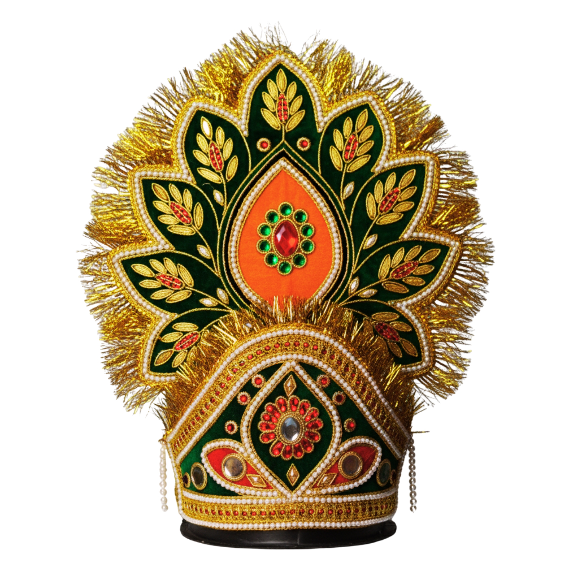 Add a royal and divine charm to your child’s festive attire with this Elegant Green & Gold Mukut. Beautifully designed with golden lace, shining beads, and colorful gems on a velvet base, this crown reflects traditional Indian artistry.