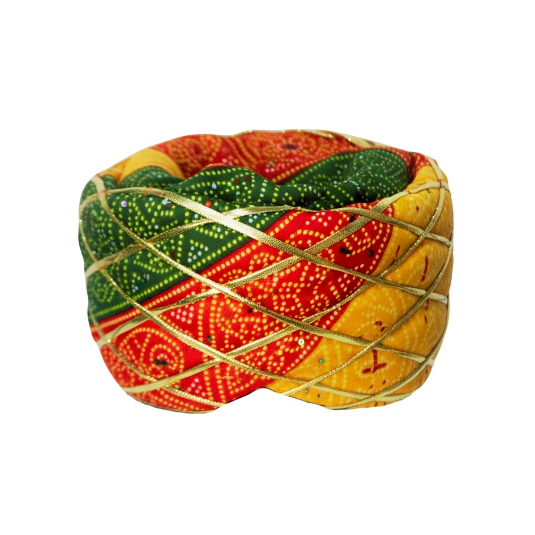 Celebrate heritage with this Royal Rajasthani Pagdi, handcrafted in vibrant hues of orange, red, and green Bandhej fabric, beautifully wrapped with golden lace detailing. Its traditional design reflects royal elegance and devotion — perfect for adorning Lord Krishna, Bal Gopal, or for festive décor.